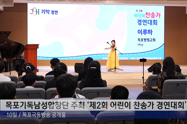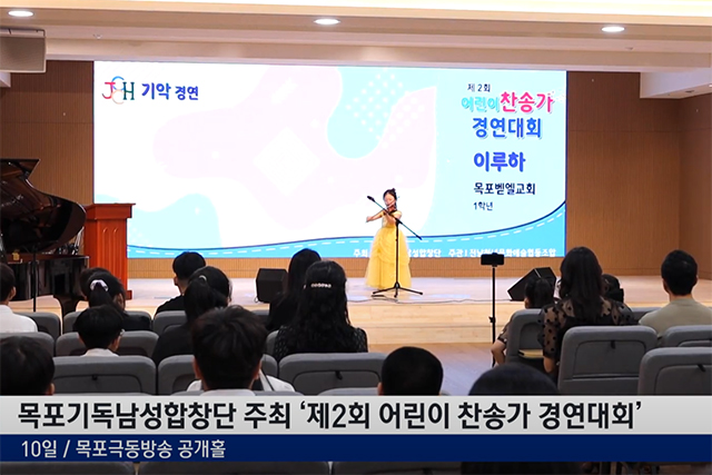 목포기독남성합창단이 주최한 ‘제1회 어린이 찬송가 경연대회’가 목포지역 교회학교 60여 명의 어린이가 참여한 가운데 진행됐습니다.이번 대회는 성악과 기악 부문으로 나눠 ‘주를 앙모하는 자’, ‘사철에 봄바람 불어있고’ 등의 지정곡으로 예선을 치뤘으며, 26일 주일엔 15명의 본선 진출 어린이들의 연주회도 함께 마련됐습니다.